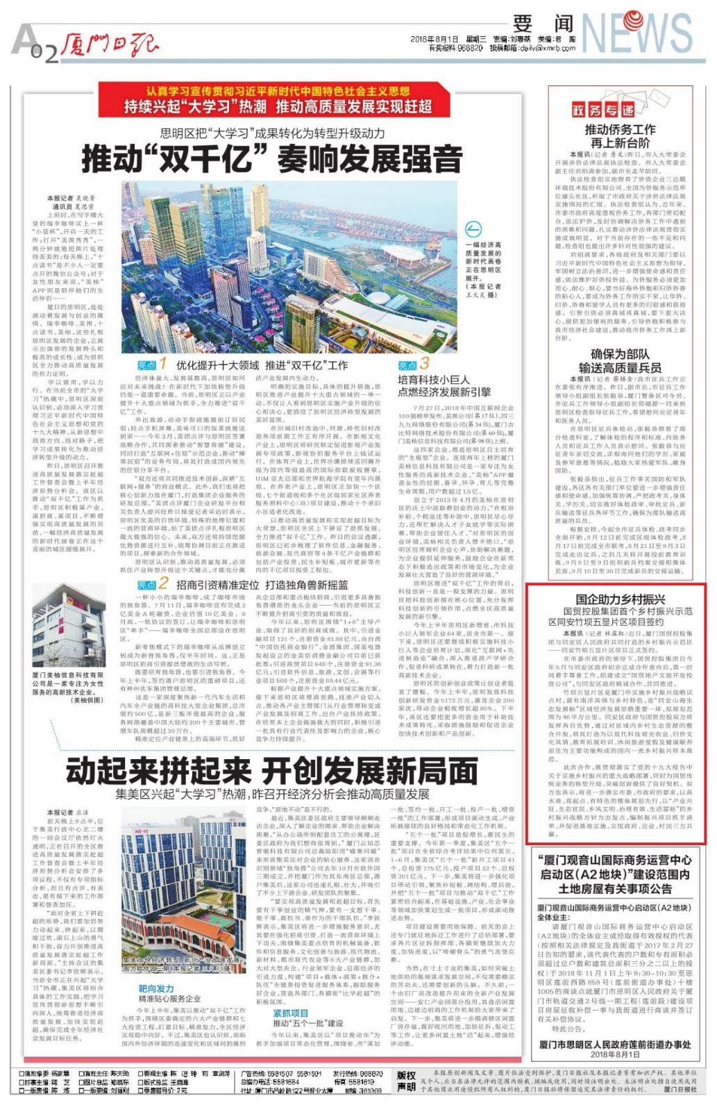 8月1日,廈門日?qǐng)?bào)專題報(bào)道了《國(guó)企助力鄉(xiāng)村振興——國(guó)貿(mào)控股集團(tuán)首個(gè)鄉(xiāng)村振興示范區(qū)同安竹壩五顯項(xiàng)目正式簽約》。