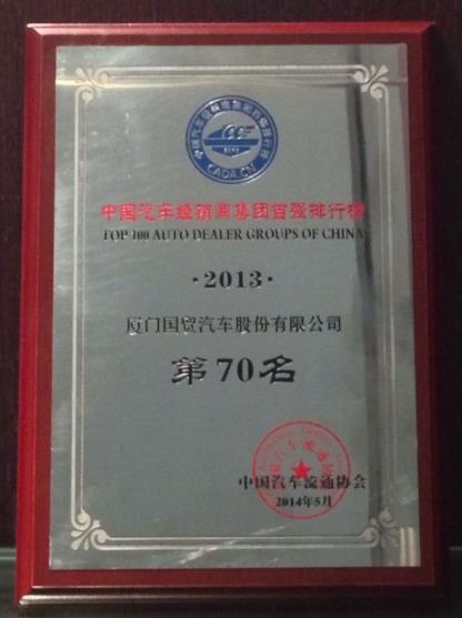 5月28日,中國(guó)汽車流通協(xié)會(huì)召開發(fā)布會(huì),揭曉2013年度中國(guó)汽車流通行業(yè)經(jīng)銷商集團(tuán)百?gòu)?qiáng)名單。繼去年首次榮登百?gòu)?qiáng)榜后,國(guó)貿(mào)汽車位居第70名,蟬聯(lián)榜單。