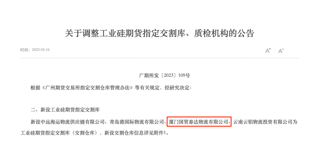 國(guó)貿(mào)股份旗下國(guó)貿(mào)泰達(dá)物流成功獲批工業(yè)硅期貨指定交割庫(kù)資質(zhì)。