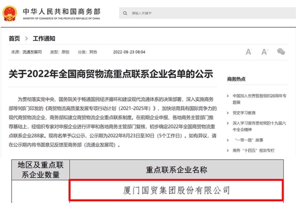 國貿(mào)股份入選2022年全國商貿(mào)物流重點(diǎn)聯(lián)系企業(yè)名單。