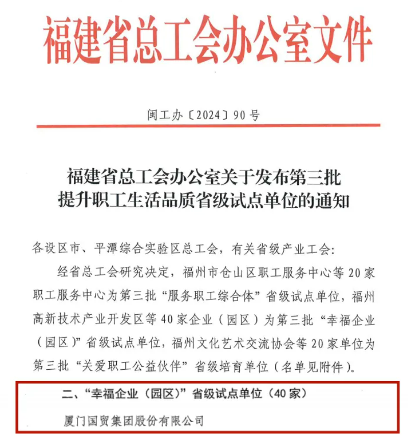 國貿(mào)股份入選福建省“幸福企業(yè)(園區(qū))”省級試點(diǎn)單位。