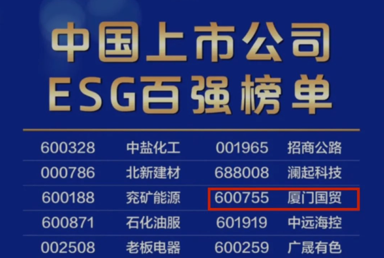 廈門國貿(股票代碼:600755)憑借在ESG方面的優(yōu)異表現(xiàn)榮獲“中國上市公司ESG百強”,并納入“中證證券時報ESG百強指數(shù)”。