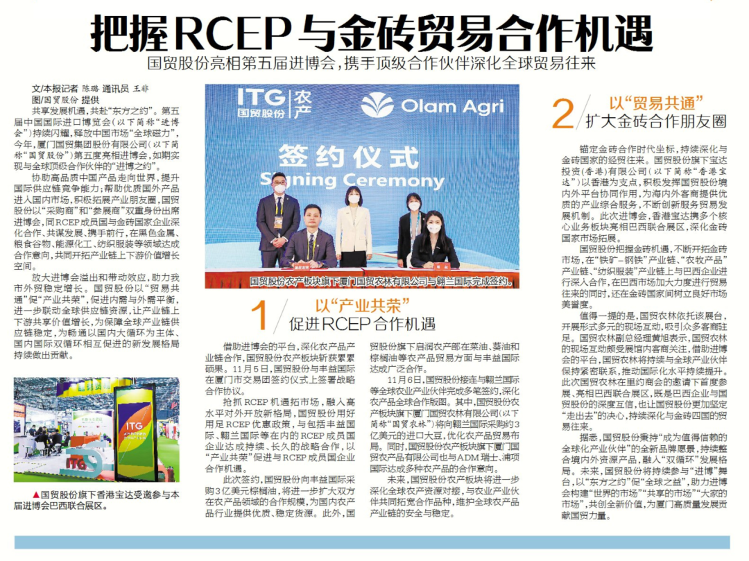 第五屆進(jìn)博會期間,國貿(mào)股份以“采購商”和“參展商”雙重身份出席進(jìn)博會,同RCEP成員國與金磚國家企業(yè)深化合作、共謀發(fā)展,引發(fā)廈視新聞、廈門日報(bào)等媒體關(guān)注。