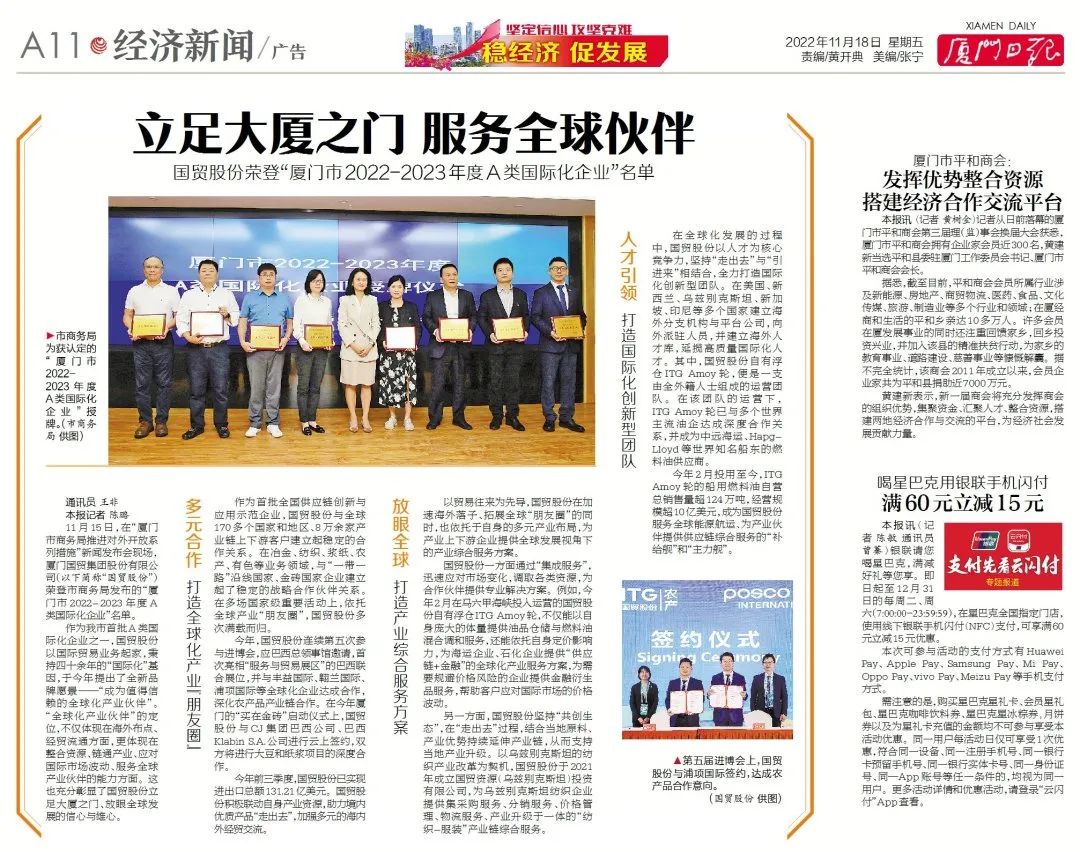 廈門日報(bào) | 國貿(mào)股份榮登“廈門市2022-2023年度A類國際化企業(yè)”名單